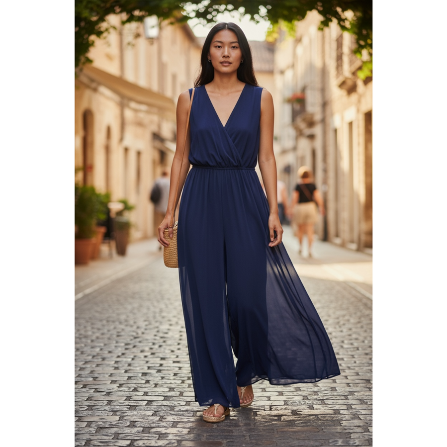 This Xtaren jumpsuit is crafted in a deep navy blue chiffon fabric with a flattering wrap-style V-neckline and a flowy wide-leg overlay. Designed with a lightweight feel and elastic waist, it offers an elegant yet comfortable option for both casual and dressier occasions.